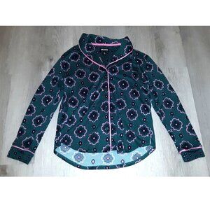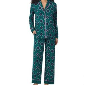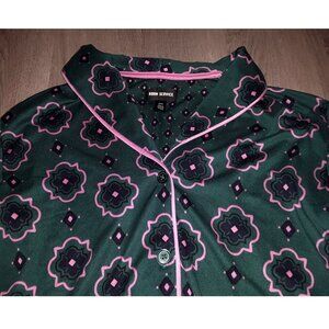Women's Room Service shawl collar green and pink retro geometric pattern pajama set - button up long sleeve pajama shirt/sleep top and long pants. Both are size SMALL. Button down closure on the shirt. Stretchy elastic waistband with an adjustable drawstring on the pants. Very good condition. No stains, holes, or rips.