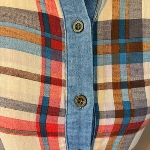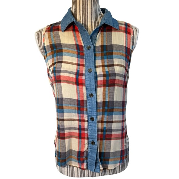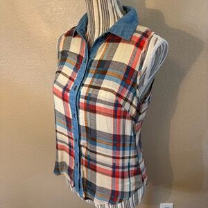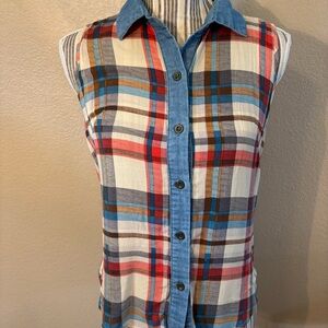 Lightweight sleeveless shirt that buttons down the front. Plaid pattern in red, white, brown, and blue, with a blue chambray trim and collar.