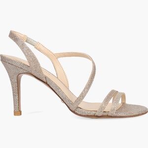 An asymmetric vamp strap creates stunning dimensions on a metallic sandal lifted by a tapered heel.
