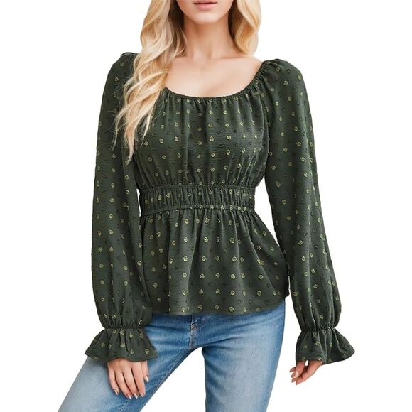 Check out this Rooscier Green Swiss Dots Puff Long Sleeve Scoop Neck Ruffle Hem Blouse today!