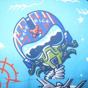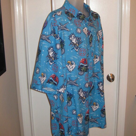 The Roosevelts Top Gun Wingman RSVLTS Shirt for men in size 4XL/5XL, features a graphic print of Maverick & Goose Wingman from the Top Gun movie, making it a perfect addition for fans of the film. This blue multi-color short sleeve button-up shirt is made from a lightweight polyester blend, making it suitable for casual occasions and travel during the summer, fall, and spring seasons. With a regular fit and button-down collar style, this shirt offers a comfortable and easy-care option for men who appreciate both style and convenience.