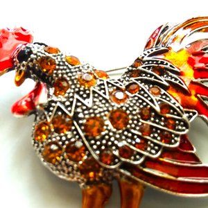 Orange Rooster Brooch Pin Inlay Rhinestone Chicken Sparkle