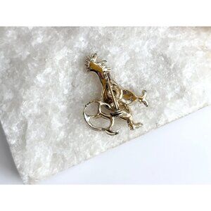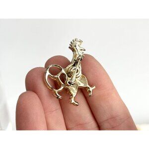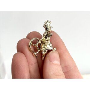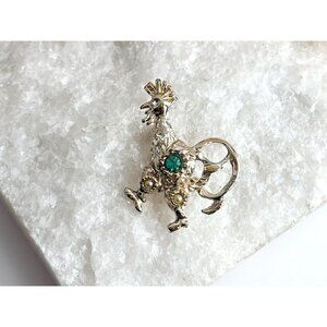 Lovely little gold toned rooster brooch. The brooch has a blue-ish rhinestone at the center of the body. The rooster is mid-step. Vertical enclosure. Lovely gift idea!