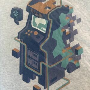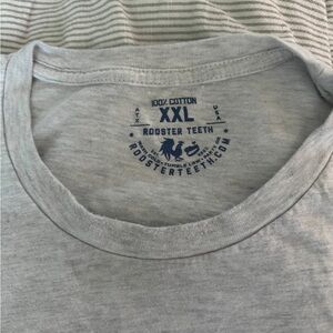Gray Rooster Teeth t-shirt featuring a colorful arcade machine graphic.