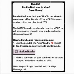 Bundle with other items from our closet to save on shipping. If you need help or have questions on how to bundle, please ask. We are here to help. Bundles of 2 or more items typically are eligible for a price and shipping discount .