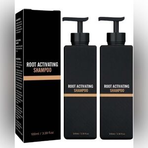 Set of two root activating shampoos. Sleek black bottles with pump dispensers.