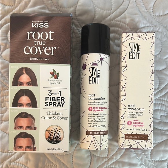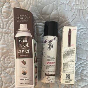 3 products for 1 price. All new & full size. Style Edit color is medium brown & Kiss Root True Color is dark brown.