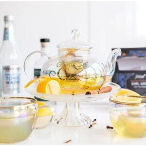 Indulge in a whimsical tea or cocktail experience with this enchanting G&Tea set. The iridescent glass teapot and cups shimmer, evoking moments of elegance and delight. With gold accents and an alluring design, it transforms every sip into a story worth sharing.