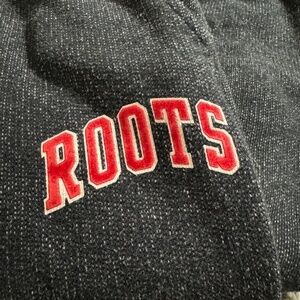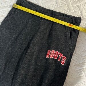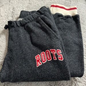 All measurements are approximate when taken with the measuring tape to act as a guide for fit only. Tag is labeled size 12. Unisex. Made by Roots from the Roots Cabin line. Drake grey with cream and red cuffs. Cotton-polyester fabric content blend. Cozy track pants joggers sweatpants sweats activewear loungewear play all day pants for boy or girl. Nothing is printed on the butt. No major flaws. Good preloved used condition from a smoke- and pet-free home.