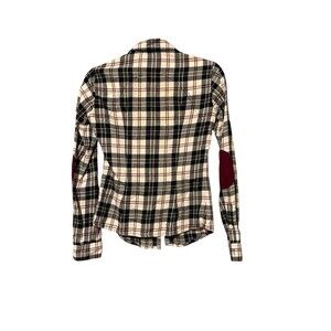 Roots Flannel Shirt Feminine Cut Size XS White Black Maroon Elbow Patches READ. Missing a button at the cuff of the right sleeve. Not an issue if you roll the sleeves up a couple turns :). 100% cotton flannel. Very soft. Overall great condition