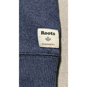 Comfy and classic Roots pullover hoodie in heathered navy blue with textured appliqué “ROOTS” lettering across the chest. Features a drawstring hood, kangaroo pocket, ribbed cuffs/hem, and a soft loop-back interior. Great everyday sweater for casual wear.
