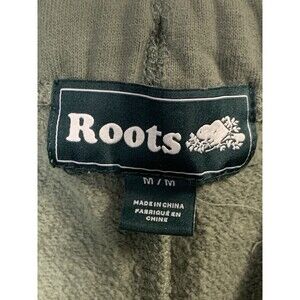 The product is a pair of women's medium green knit joggers by Roots. These sweatpants feature a solid pattern, drawstring closure, and tapered leg style. Made from a comfortable cotton blend material, these pants are suitable for various occasions such as travel, activewear, and casual wear. The joggers also have an elastic waist, pockets, and breathable fabric, making them perfect for outdoor activities or gym workouts. With a statement logo detail and a versatile green color, these sweatpants offer both style and functionality for women on the go.