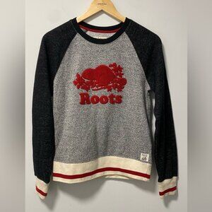 This is a women’s Roots sweatshirt in grey with a bold red Roots logo, size Small. Made from a soft cotton-poly blend, it’s cozy, classic, and perfect for everyday wear or layering.