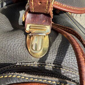 Measures 13" by 12". Base measures 9 1/2" by 5". Handle and shoulder straps with adjustable brass buckles.