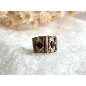 Vintage sterling silver ring. The ring is adjustable with an open side. The ring has rope accents with dark stones set along the middle. I cannot figure out what stones they are. Fits my pinky but can fit a larger finger if you open it up a bit more gently.