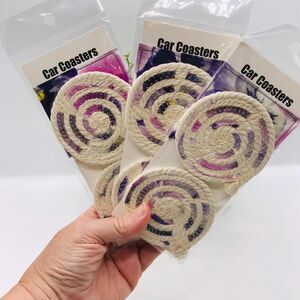 Rope Car Coasters Boho Purple Pansies Cream One Set of 2 For Car Cup Holders