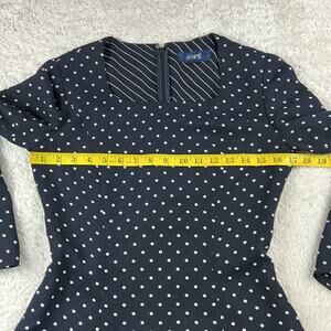 Rope fit and flare dress features a navy blue and white pinstripe pattern overlaid with navy and white polka dot chiffon. Long sleeves, with peekaboo slits at cuffs, and sides of skirt. Comes with removable matching cloth belt. Not much for stretch and no pockets. Size 9AT - from measurements would best fit a US small.