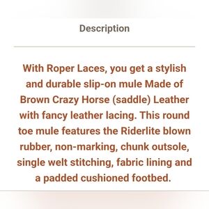 Roper Laces Brown leather mule shoes. Preowned but in good condition.