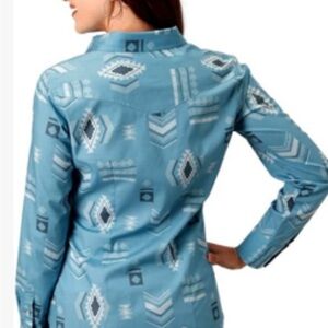 This stylish button-down shirt from Roper features a vibrant blue color with a notched collar and long sleeves. The shirt is designed with a unique geometric tribal pattern in white, adding a touch of western-inspired flair. Perfect for casual wear, it offers a comfortable fit with its light to medium weight fabric.