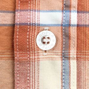 Roper men’s rancher button down shirt sz M. Coral with white, orange, and blue plaid. Double button chest pockets. Embroidered logo. Roper engraved buttons.