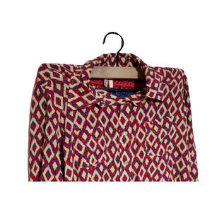 Soft and lightweight Roper button-up featuring a bold boho diamond print with contrast hem and sleeve accents. Collared neckline, snap closure, and two chest pockets. Great for cozy layering or everyday wear. Smoke-free home.