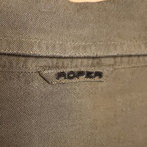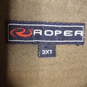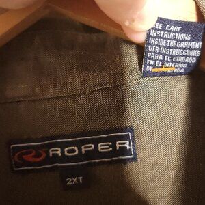 Roper men’s heavyweight green button down shirt 2XT. Gently used condition. Measurements are:24” sleeve, 31” from shoulder to hem, and 26” from armpit to armpit.