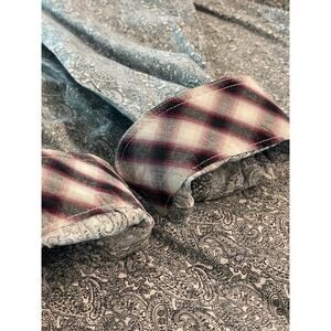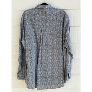 in absolutely perfect pre-owned condition. Look close at this beautiful pattern. Its a Black and White Paisley, with a contrasting inner cuff and collar of a purple toned plaid. This is such a good look when paired with jeans and the cuffs rolled back for a casual night, or boots and jeans for a western event. Very striking men's button down long sleeve shirt by Roper. Size is XL.