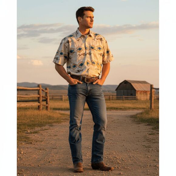 Shirt is in excellent used condition. Awesome geometic Aztec pattern with a Cowboy chasing down a cow all over.