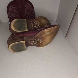 Used, scuffs on toes (shown in photos). Vintage stylish cowboy boots by Roper. Features intricate embroidery. Perfect for a chic look.