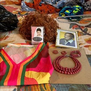 Set includes colorful kaftan dress (worn once), wig (worn once with unused hairnet), necklace, bracelet and earrings (never worn), and photo of Stanley.