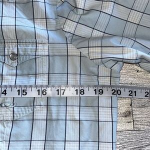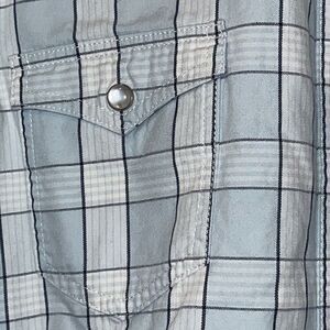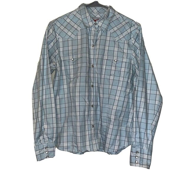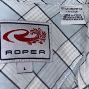 This Roper shirt is a must-have for any cowgirl's wardrobe. The blue plaid cotton fabric is perfect for all seasons and the long-sleeved button-up style with a collared neckline and casual sleeves make it ideal for both casual and dressier occasions. The shirt features snap closures and embroidered accents, adding a touch of personality to the garment. It is machine washable and easy to care for, making it a convenient addition to any wardrobe. The shirt is a size large and has a regular fit.