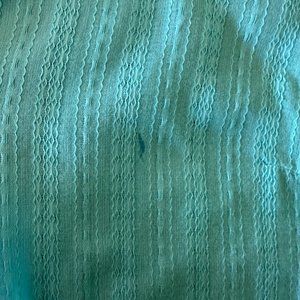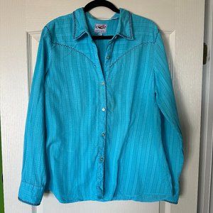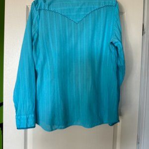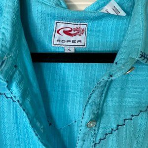 All cotton, vintage custom-dyed Roper Western button-down shirt. Women’s cut with narrower waist and darts. Back yoke. Custom bright turquoise color with dark blue embroidery.