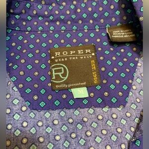 This Roper button down shirt features a white polka dot and diamond pattern. Designed with a notched collar and short sleeves with pearl snap front closures. Front pockets. Material tag removed. This is cotton.