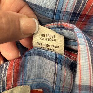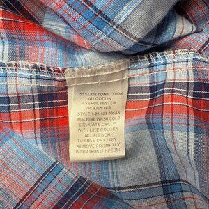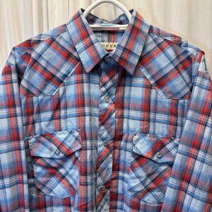 This shirt features a blue and red plaid pattern and classic western styling, it includes pearl snap buttons and a traditional yoke design. The cotton blend fabric feels sturdy yet comfortable.