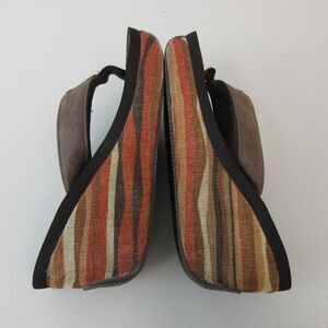 Description: Earthy tones. Multicolored striped on the side. Foam footbed. Wedge height of approximately 3 inches. Textured soles. Would look great with a maxi dress.