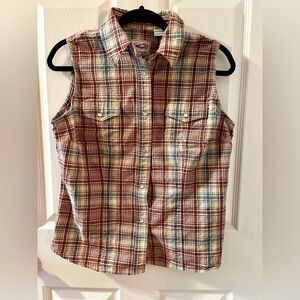 Red, white, tan and blue plaid, collar, pearl buttons, yoke in back. Size: L. Pit to pit: 20”, length: 24.5”, 100% cotton, excellent condition