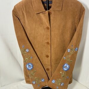 Classic Roper suede jacket with nylon lining, beautiful blue flower embroidery down both sleeves and across the back. This is a stylish piece that can easily paired with jeans or dressed up for an evening look.