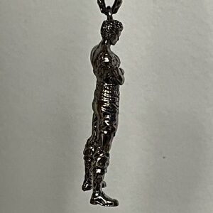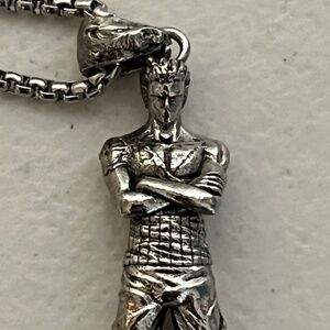 Brand new. Has detailed alloy casting, and comes with a 24" stainless steel round box chain with a lobster clasp. Unbranded.