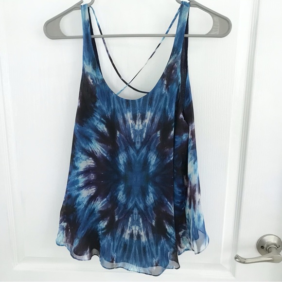 Lovely layered top, watercolor print of blue. White, purple and black over a navy under layer, criss cross spaghetti straps, quite elegant, U/A to U/A is 17” and from top of strap to hemline 24”, NWT