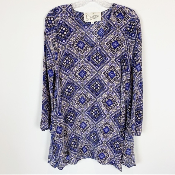 Purple Print Silk Top by Rory Becca. Top is Tunic Length and has Handkerchief Style Bottom. Excellent Preowned Condition. Care Tag has been Removed but it is Dry Clean Only. Length is 30”
