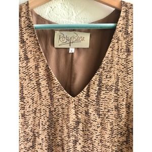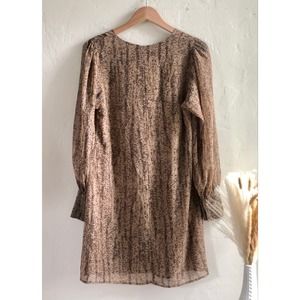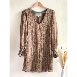 Rory Beca Snakeskin print shift dress. Features a v-neckline, long bubbled sheer sleeves. Straight cut, side zip closure. Lined.