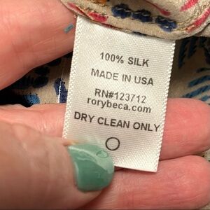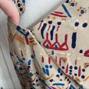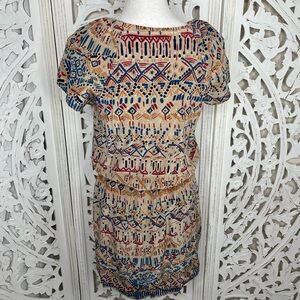 Rory Beca Tan Multicolor Silk Faux Wrap Mini Dress in excellent condition- gently worn with no flaws. Faux wrap style, mini length, multicolor pattern. 100% silk. Slight puff sleeve, very pretty!