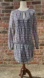 Beautiful Rory Beca dress has a drop waist with a drawstring and blue and white static print all over. Dark blue layer underneath to keep the shell of the dress from being transparent. Transparent sleeves. Long sleeved.