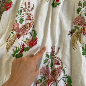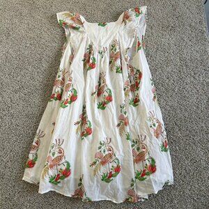 This lightweight cotton dress showcases a vibrant peacock and floral print, designed for comfort and style. It features flutter sleeves and a relaxed fit.