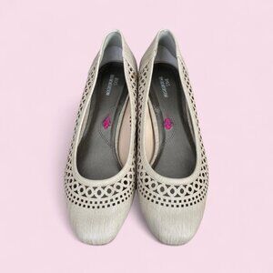 Integrating optimal fit, comfort, and style, Ros upholds their dedication to providing the widest and most comprehensive selection of sizes and widths for women seeking a reliable fit and unparalleled comfort, just like this adorable pair of flats! Employing their distinctive Tiny Pillows insoles, these exceptional comfort footbeds rebound with each step, delivering a massaging sensation for the feet while ensuring remarkable walking comfort. Pre-owned in excellent condition. The inside has cushion pad inserts.