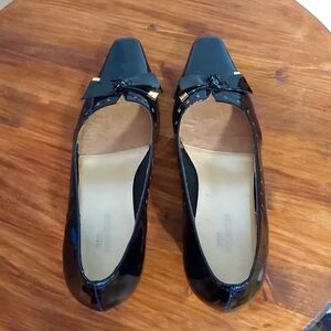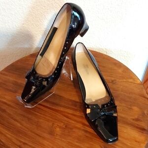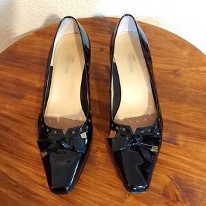 Ros Hommerson Womens Black SHINY patent Leather Bow Toe Luxury Heels Sz.7.5