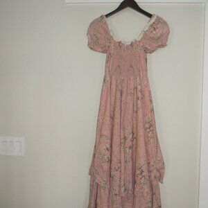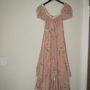 It has a pink floral fabric, lacy collar, and comfortable boning. The skirt is absolutely beautiful, with two layers featuring ruffles and ruches.