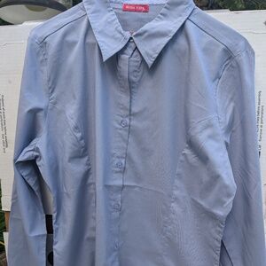 This is a Blue button down top from the brand Rosa York made in Vietnam out of 70% Cotton 30% Lycra.