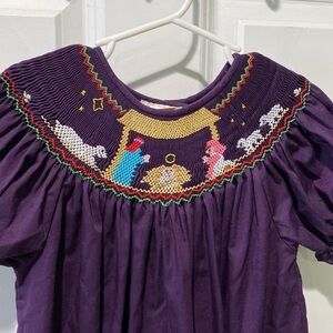 Holiday Christmas Christian baby Jesus star lamb red green embroidery smock pleating pleats party pictures religion religious church unique puff sleeve