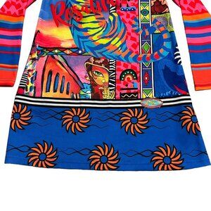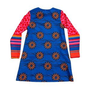 This precious dress features a long sleeve style in a vibrant color palette. It has a mix of busy print materials, including a large tiger across the front. There is zipper detail at the front of the shoulders. There are some material imperfections on the sleeves shown in pics, but otherwise just minor wear and looks fantastic! Size 8Y (128cm)